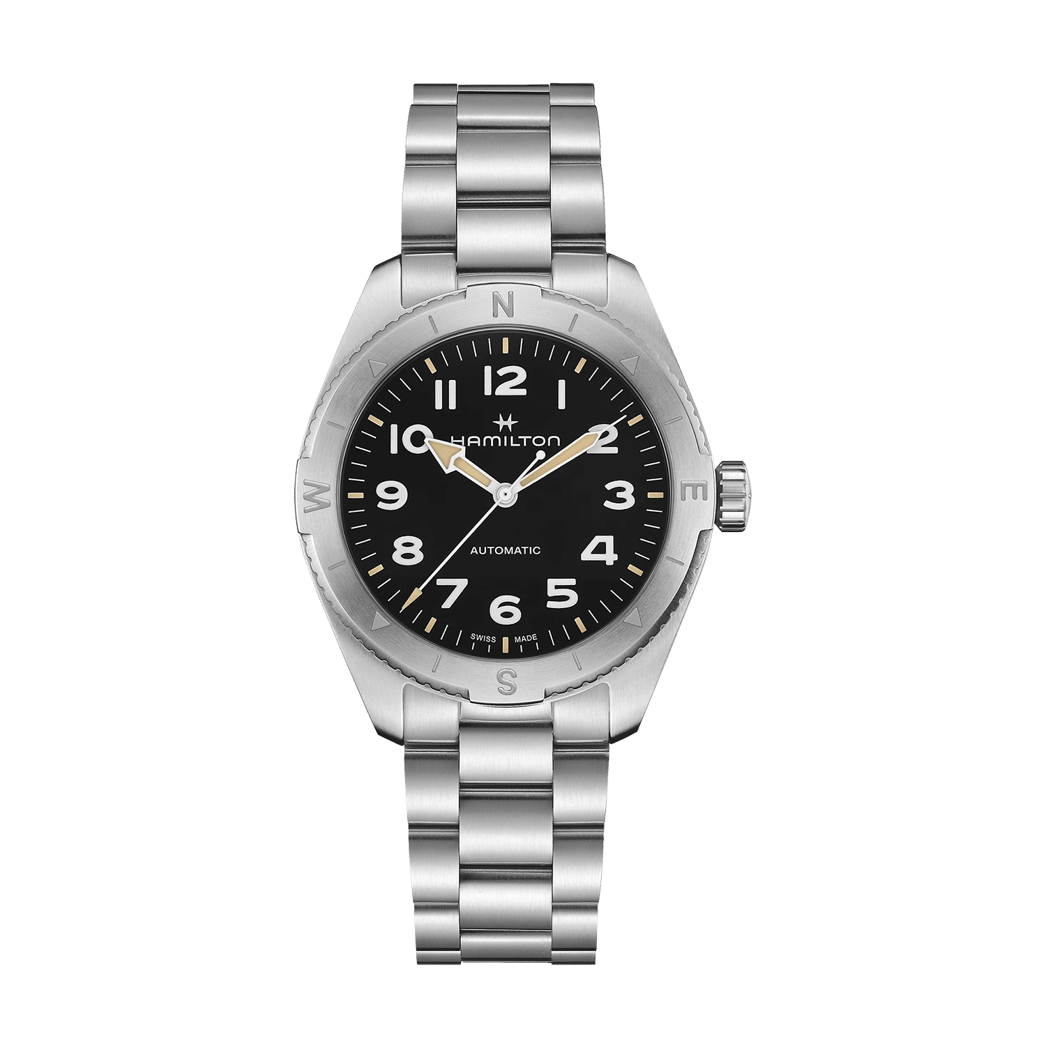 Gjør deg klar for friluftslivet med Khaki Field Expedition, en klokke for alle typer eventyr og terreng. Klokken har et kompassdesign som hjelper deg å navigere eventyrene dine med solen som guide. 41mm kasse i rustfritt stål og matchende lenke. Klokken er utstyrt med en skrukrone for å beskytte urverket uansett værforhold. Med en svart teksturert urskive og Super-LumiNova®-belegg for optimal lesbarhet, er Khaki Field Expedition klar når du trenger det mest.