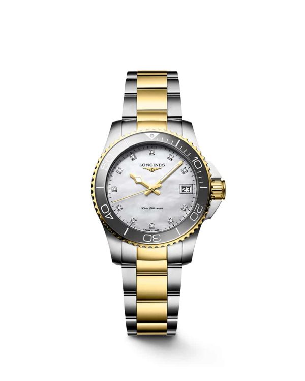 Longines HydroConquest er vanntett til 300 meters dybde. Klokken er drevet av Quartz urverk Calibre L156 og leveres med stål lenke og gullfarget PVD- belegg.