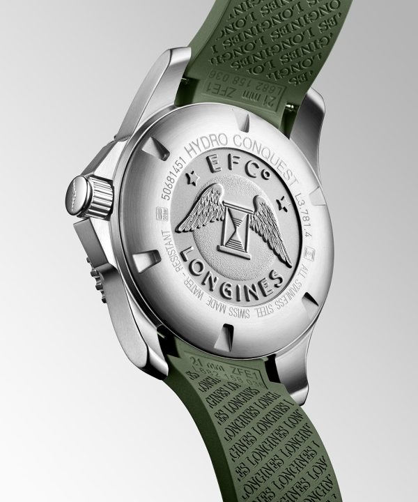 Longines HydroConquest Ceramic er vanntett til 300 meters dybde. Klokken er drevet av Longines automatisk urverk Calibre L888 med opp til 72 timer gangereserve, leveres med en grønn gummirem med foldespenne.