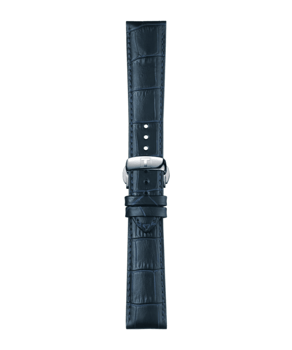 Original blå skinnrem med butterfly-lås med utløserknapp. Reimen har enkelt og raskt utskiftbart feste. Kompatibel med blant annet Tissot Gentleman.